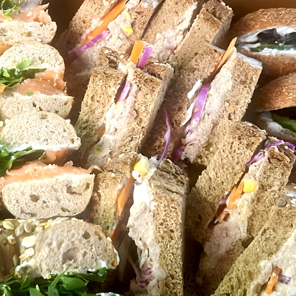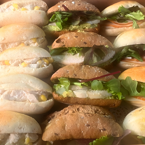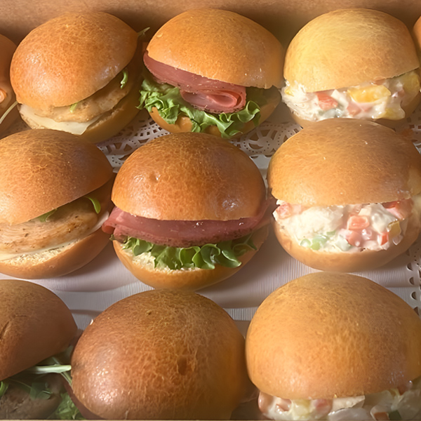 A variety of mini sandwiches made with fresh ingredients and soft breads—great for team lunches or picnics.